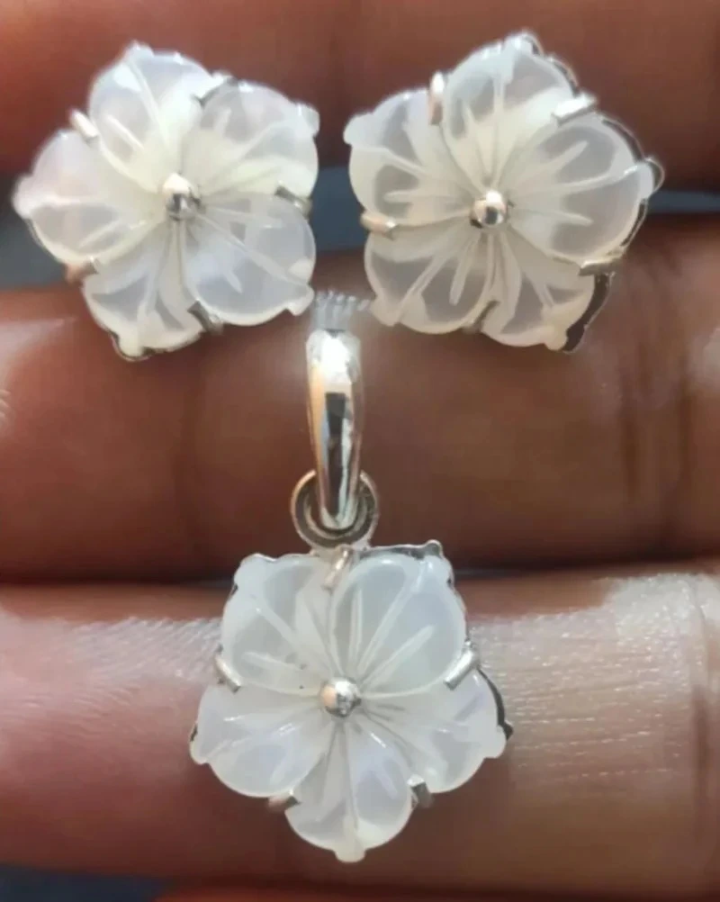 Elegant 92.5% pure silver jewellery set featuring beautifully carved Mother of Pearl. Includes matching earrings and pendant, perfect for adding timeless charm to any outfit.